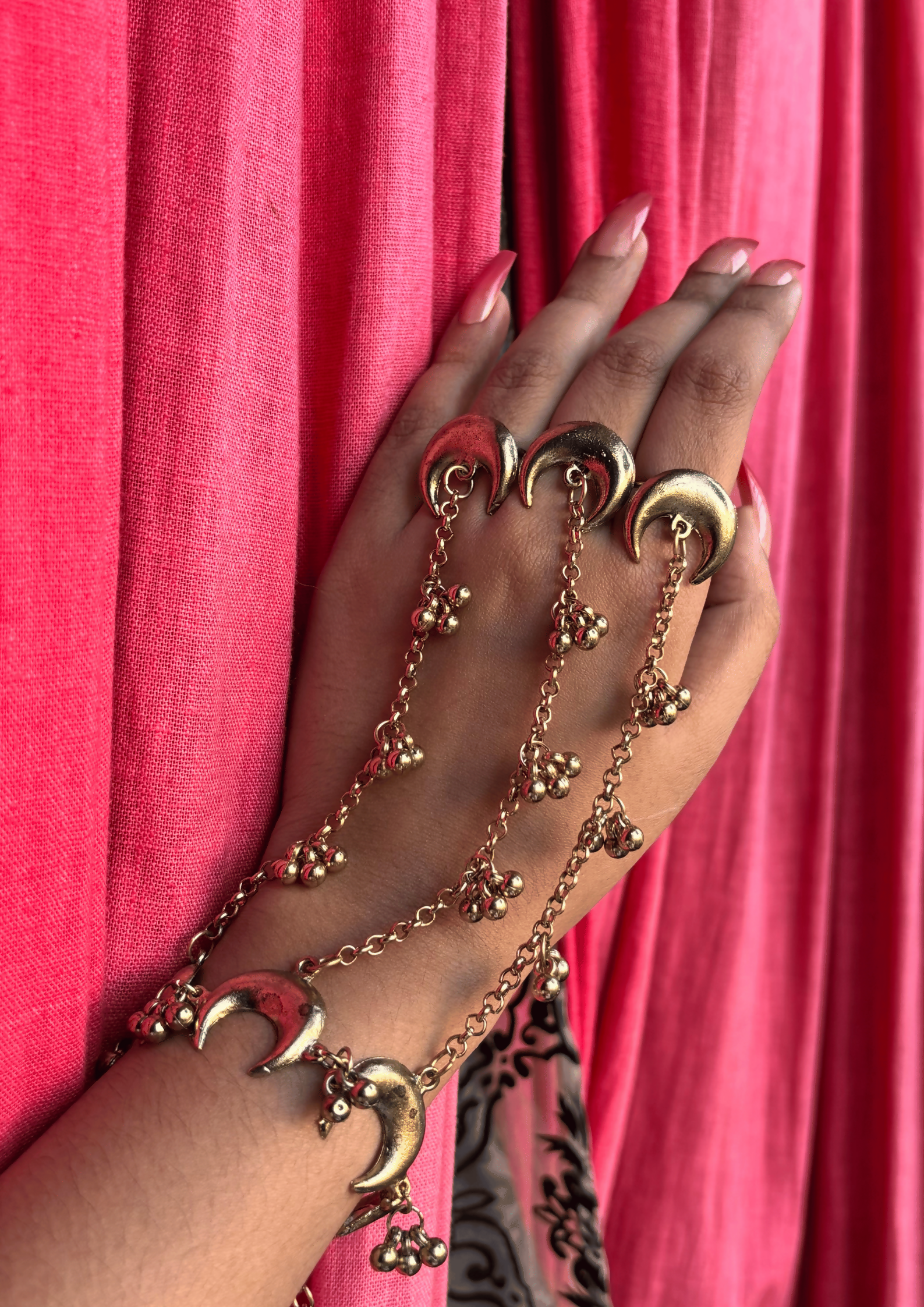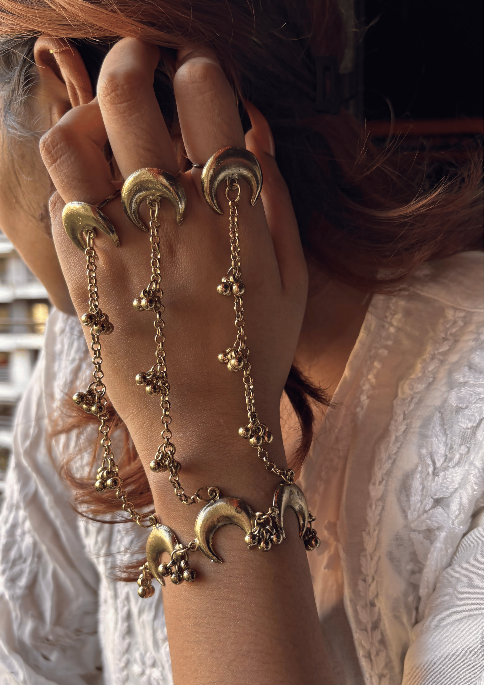 Structure: One finger ring connected to a wrist bracelet with cascading chains