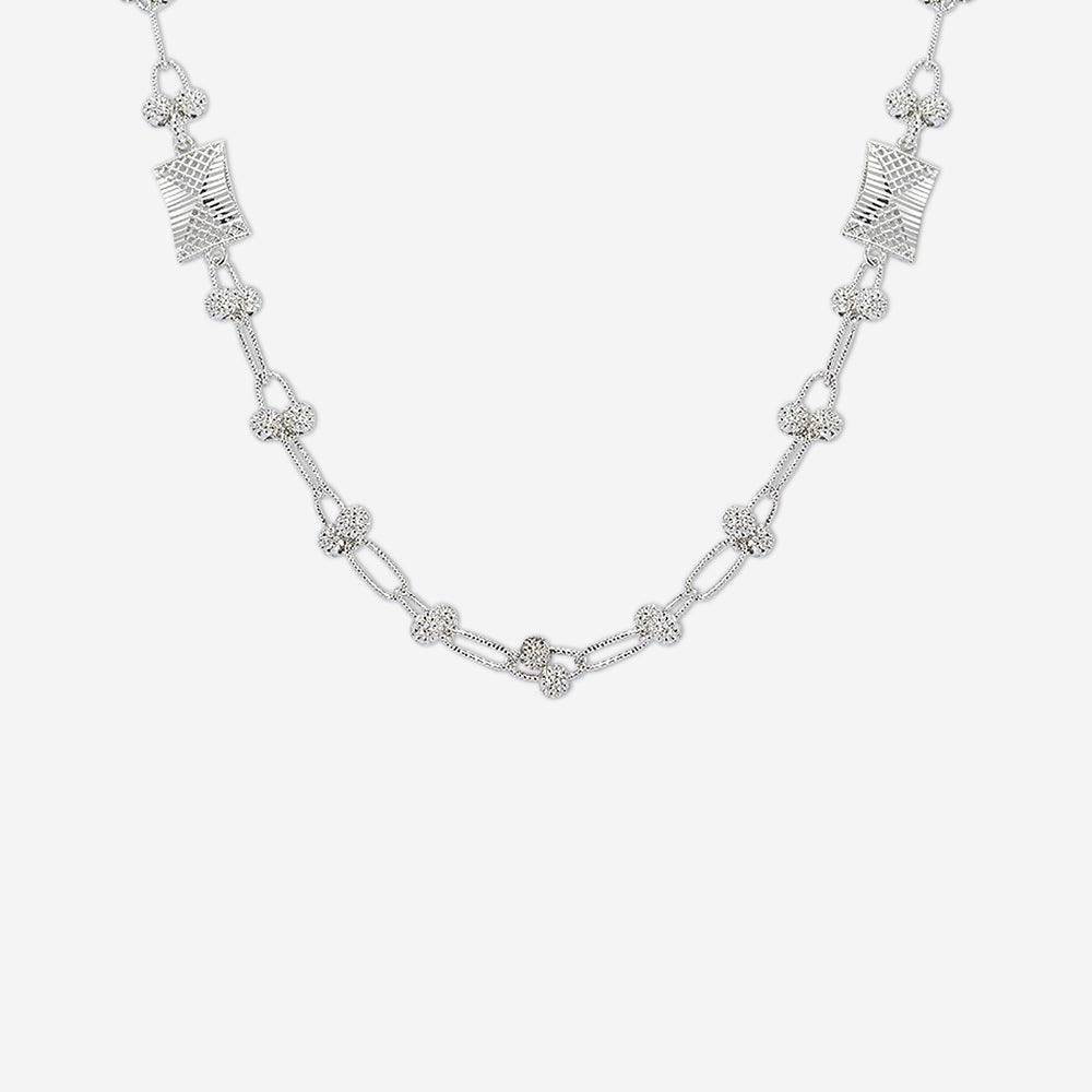 Illuminate your neckline with the mesmerizing charm of the Twilight Gleam Silver Chain. Designed in 925 sterling silver, this chain showcases a unique interplay of textured floral and geometric motifs, creating an artistic rhythm that dances with the light. The intricate mesh-inspired rectangular elements add a modern architectural flair, perfectly balancing tradition with trend. Whether layered with your favorite pendants necklace or worn solo for a statement look, this chain exudes quiet sophistication. Its subtle shimmer resembles the soft gleam of twilight, making it an elegant companion from day to evening. Lightweight and graceful, it wraps your personality in refined charm. The chain sits comfortably and pairs effortlessly with any outfit ethnic, casual or formal. It’s not just an accessory; it’s an aura.